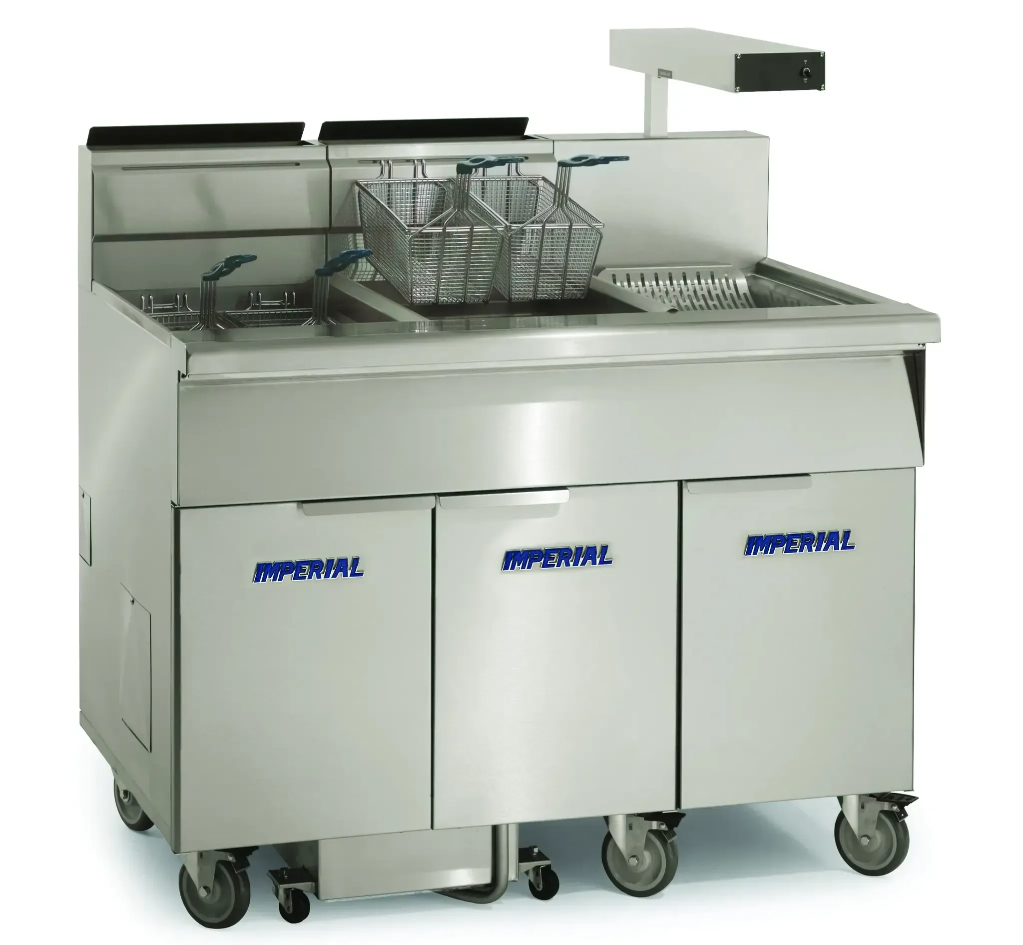Master the art of flavor with the Imperial IFSCB350E Electric Fryer. This floor model fryer is perfect for commercial restaurant use, offering a 50lb. capacity in each of its three batteries. The immersed elements ensure quick and efficient cooking, while the built-in filter system keeps your oil clean and extends its lifespan. With a dump station and a 5.5 GPM roller pump, this fryer allows for easy and convenient oil disposal. The snap action thermostat ensures precise temperature control, resulting in perfectly cooked food every time. The Imperial IFSCB350E also includes a food warmer, dump pan, joiner strips, and a filter starter kit, providing everything you need to get started. Made with stainless steel frypots, front, and sides, this fryer is durable and easy to clean. With its casters and 1/3 HP motor, it is also easy to move around your kitchen. Trust Imperial to deliver exceptional quality and performance for your commercial restaurant needs.