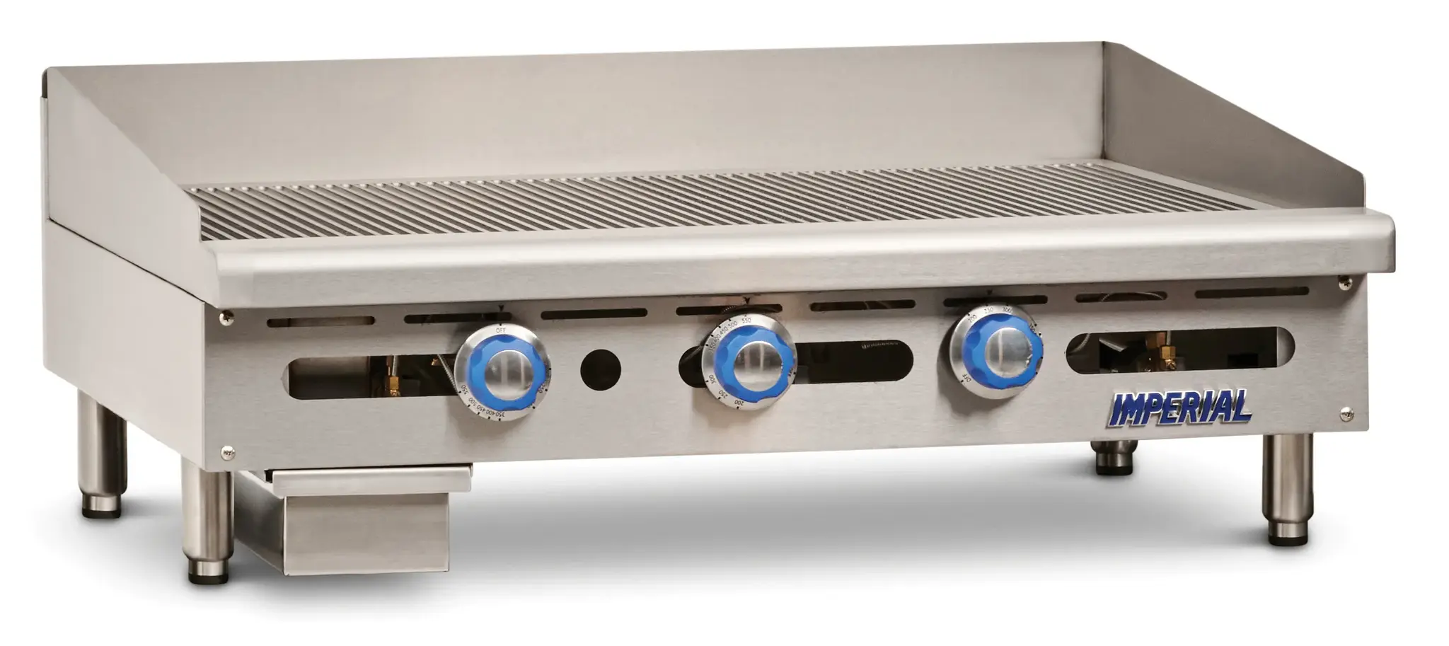Craft culinary wonders with the Imperial IGG-72 Griddle, Gas, Countertop. This high-quality griddle is designed to meet the demands of a commercial restaurant kitchen. With a spacious 72" W x 24" D cooking surface, you'll have plenty of room to cook multiple dishes at once. The 1" thick grooved plate ensures even heat distribution and excellent heat retention, allowing you to achieve perfect results every time. The thermostatic controls give you precise temperature control, while the 4" wide grease gutter and removable grease can make cleaning up a breeze. Made with stainless steel front, sides, splash guard, and ledge, this griddle is not only durable but also easy to clean. With 180000 BTU of power, this griddle can handle even the busiest of kitchens. Trust the Imperial IGG-72 Griddle to deliver exceptional performance and reliability in your commercial restaurant.